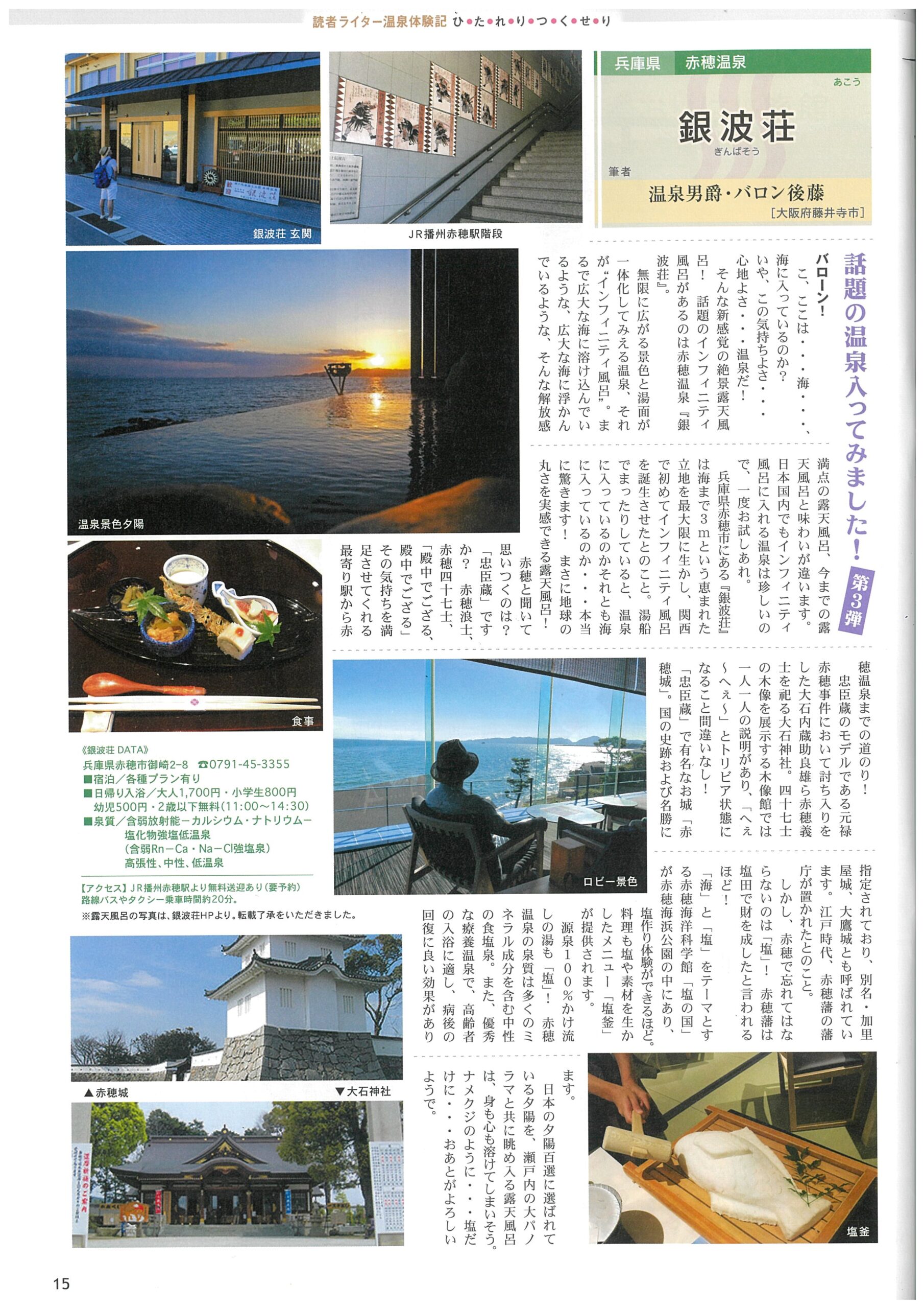 全国版で入浴体験ができる人気の月刊本です。今回は読者ライター体験記として人気の「温泉男爵・バロン後藤」さんがご利用いただき1ページにまとめられています。リニューアルされたオーシャンビューのロビーや人気のインフィニティ温泉のご利用と赤穂市内観光のご案内がつづられています。全国版として23万部発行されていますのでコンビニや書店で発売されています。