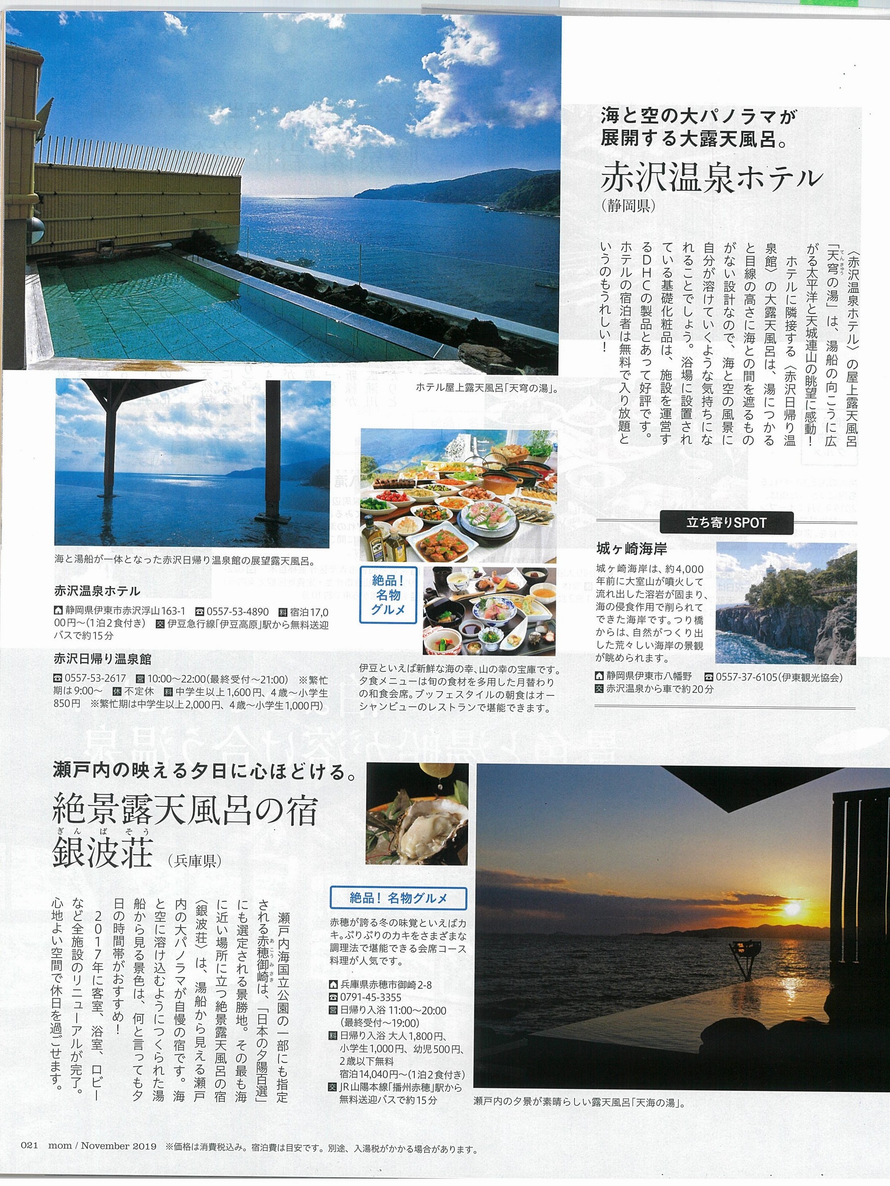 イオンカード会員向けの月刊会報誌「MOM(モム)」11月号に掲載をしていただきました。旅行お出かけ情報として「絶景と溶け合う温泉」特集で紹介をいただきました。約30万部発送されます。